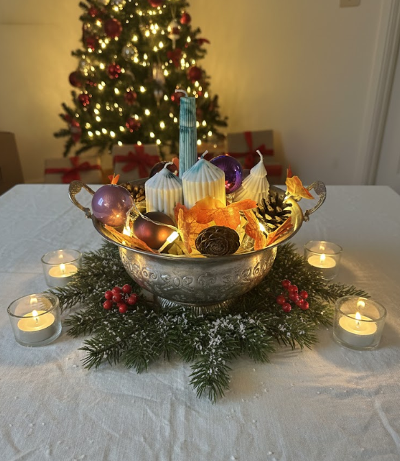Nous avons trouvé une jolie coupe en métal couleur argent, et nous avons créé ce joli centre de table pour vos fêtes de fin d'année.
